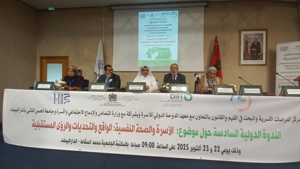 بمناسبة اليوم العالمي للصحة النفسية، تنطلق اليوم الأربعاء 29 ربيع الثاني 1447 ه موافق 22 أكتوبر 2025 الندوة الدولية السادسة تحت عنوان: «الأسرة والصحة النفسية: الواقع والتحديات والرؤى المستقبلية»، من تنظيم مركز الدراسات الأسرية والبحث في القيم والقانون، بتعاون مع معهد الدوحة الدولي للأسرة التابع لمؤسسة قطر، وجامعة الحسن الثاني بالدار البيضاء وتستمر اشغالها طيلة يومي 22 و23 أكتوبر 2025، بالمكتبة الجامعية محمد السقاط بالدار البيضاء.
