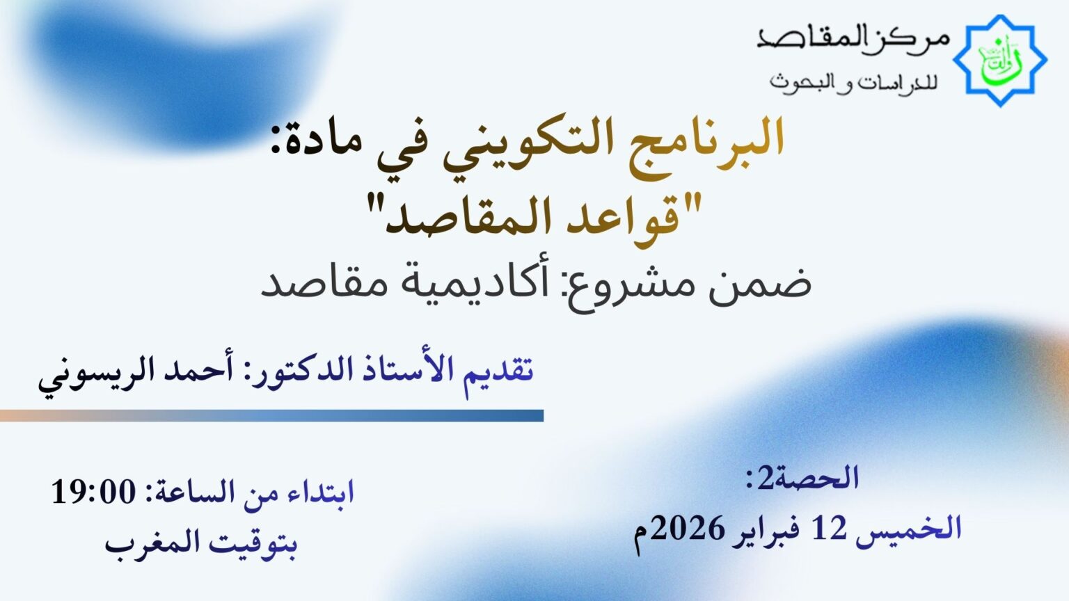 البرنامج التكويني في مادة: “قواعد المقاصد” ضمن مشروع: أكاديمية مقاصد. تقديم الأستاذ الدكتور: أحمد الريسوني