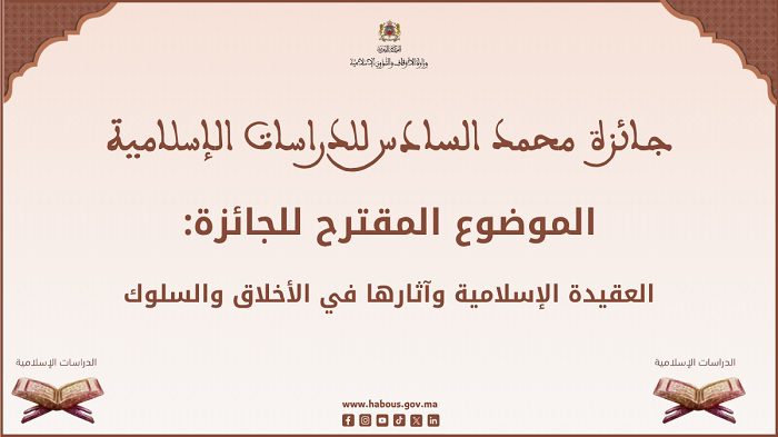 أعلنت وزارة الأوقاف والشؤون الإسلامية عن تنظيم مسابقة لنيل جائزة محمد السادس للدراسات الإسلامية، واقترحت على المشاركين التباري في موضوع “العقيدة الإسلامية وآثارها في الأخلاق والسلوك”.