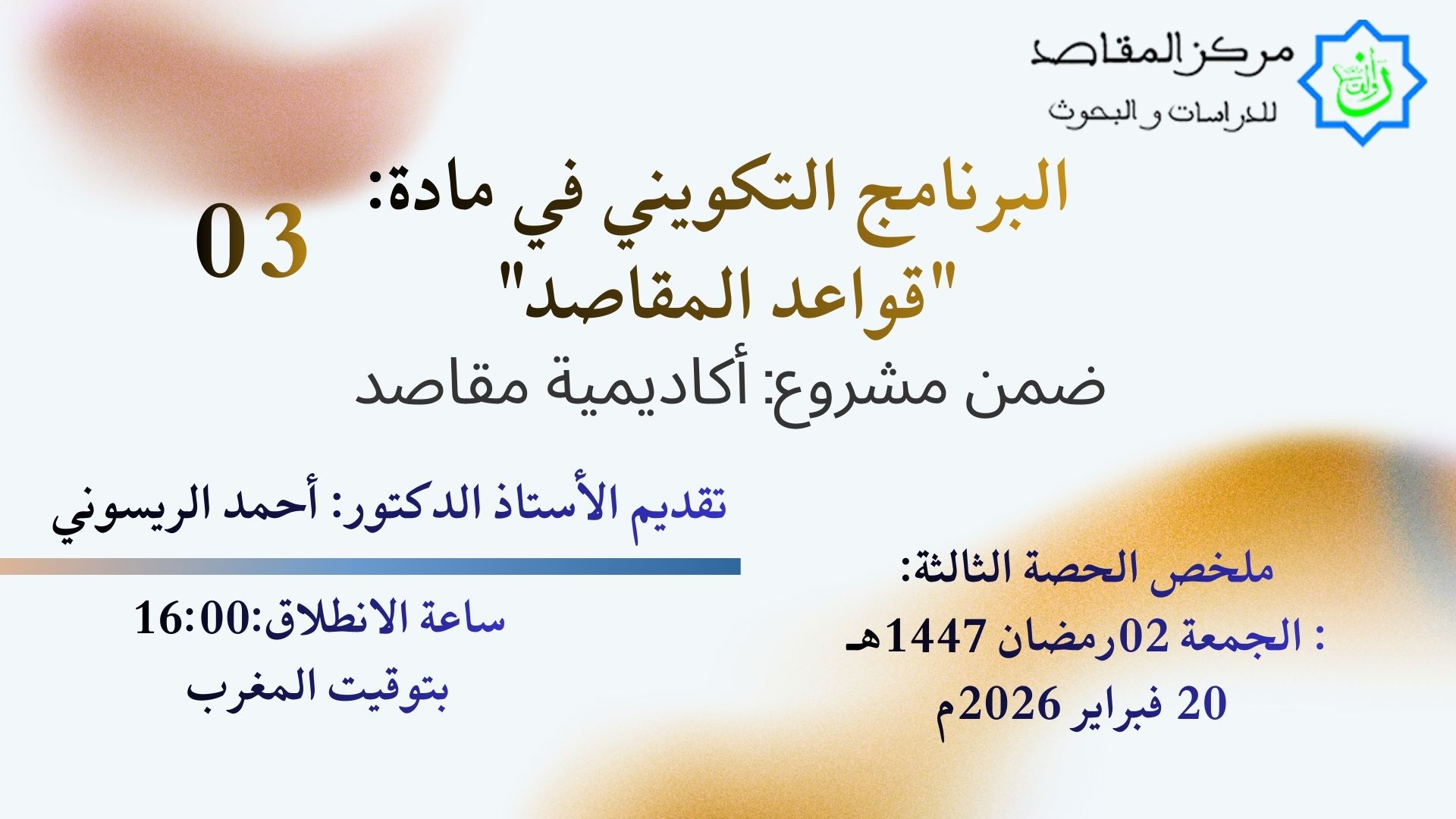الحصة3: الجمعة 20 فبراير 2026م/2رمضان:1447هـ ساعة الانطلاق:16:00 بتوقيت المغرب. مدة إلقاء العرض مع الأجوبة عن الاستفسارات:1ساعة ونصف.