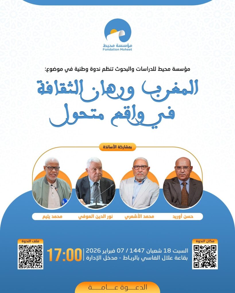 تنظم مؤسسة محيط للدراسات والبحوث ندوة وطنية يوم السبت 7 نونبر 2026 بمشاركة نخبة من الفاعلين وطنيا، رفقته ديباجة الندوة تعميما للفائدة: